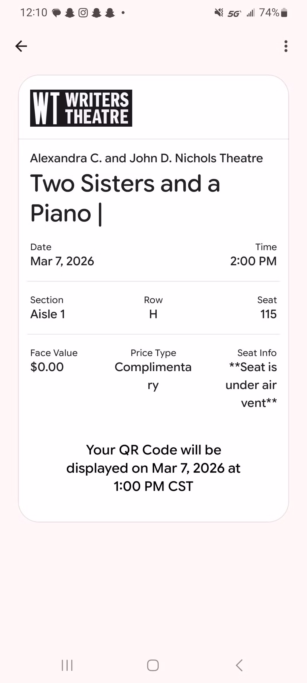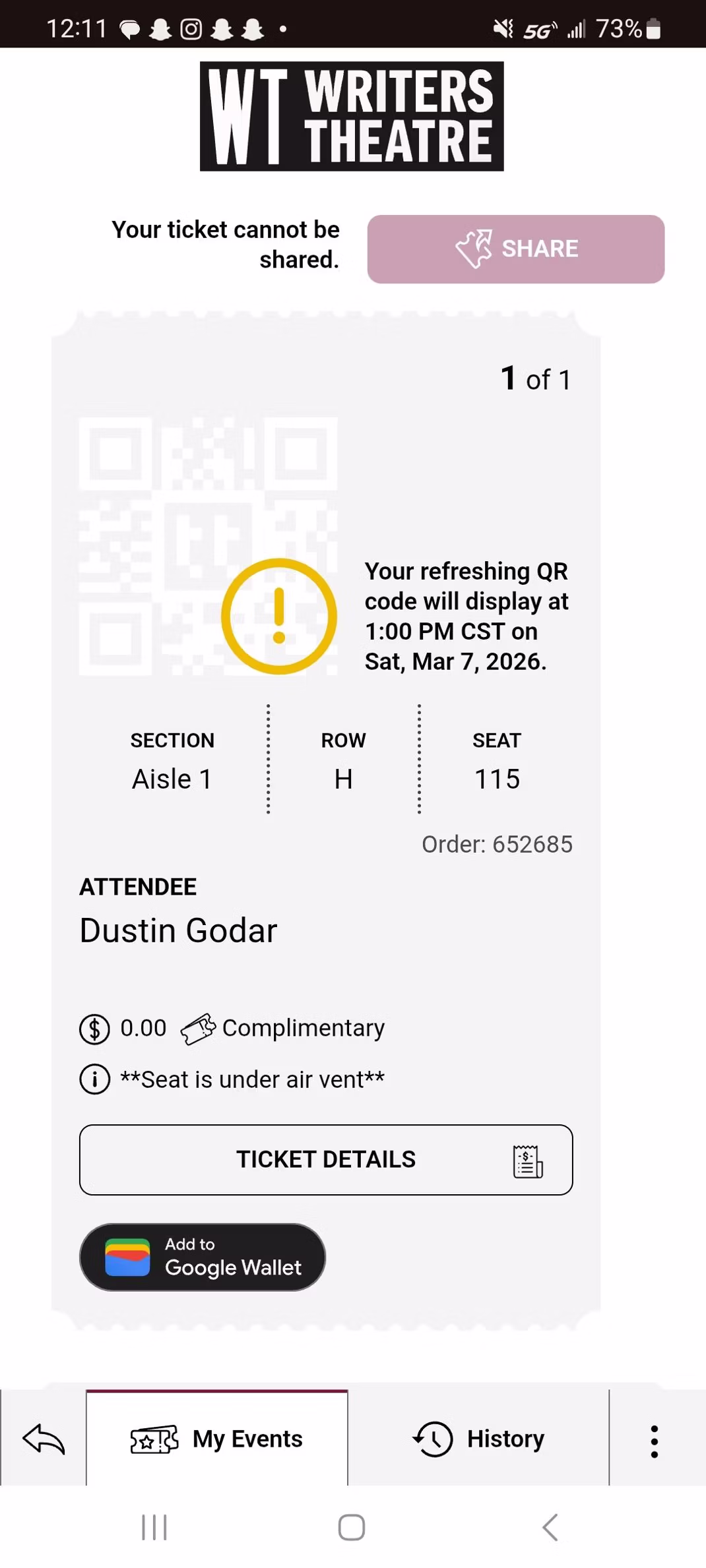 As a safety measure, the QR codes will not be visible on your tickets until one hour before your performance start time. Your QR code for your digital tickets will automatically appear in your digital wallet at that time.
